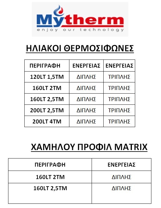 Οι ηλιακοί θερμοσίφωνες Mytherm αποτελούν μια ελληνική πρόταση με εμπειρία άνω των 30 ετών στον τομέα των συστημάτων θέρμανσης και ζεστού νερού χρήσης. Η εταιρεία προσφέρει μια ευρεία γκάμα μοντέλων που καλύπτουν διαφορετικές ανάγκες, από μικρά νοικοκυριά έως επαγγελματικούς χώρους.