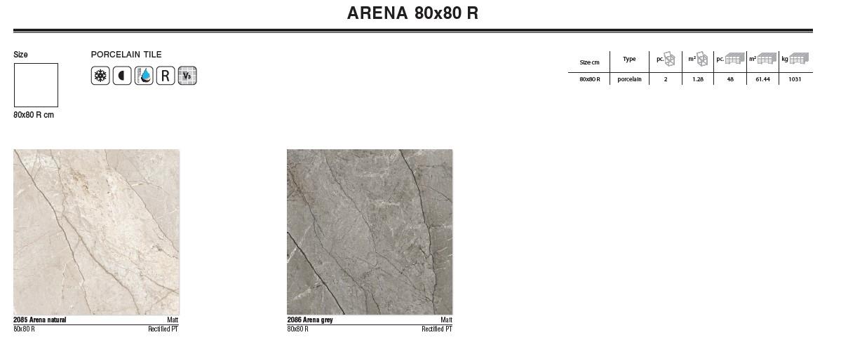 Η σειρά Arena, διαθέσιμη σε μέγεθος 60×120 R , 80×80 R και 60×120 R σε φυσικό και γκρι, εντυπωσιάζει με έναν σχεδιασμό εμπνευσμένο από πέτρα. Η τεχνολογία 3D Digital Structure τονίζει τις κομψές ρωγμές και τα ανάγλυφα των φλεβών, δημιουργώντας βάθος και ένα εκφραστικό οπτικό αποτέλεσμα. Αυτό το αποτέλεσμα αναδεικνύει την υφή και την ατομικότητα των πλακιδίων, συνδυάζοντας μία ελκυστική εμφάνιση με υψηλή ανθεκτικότητα.